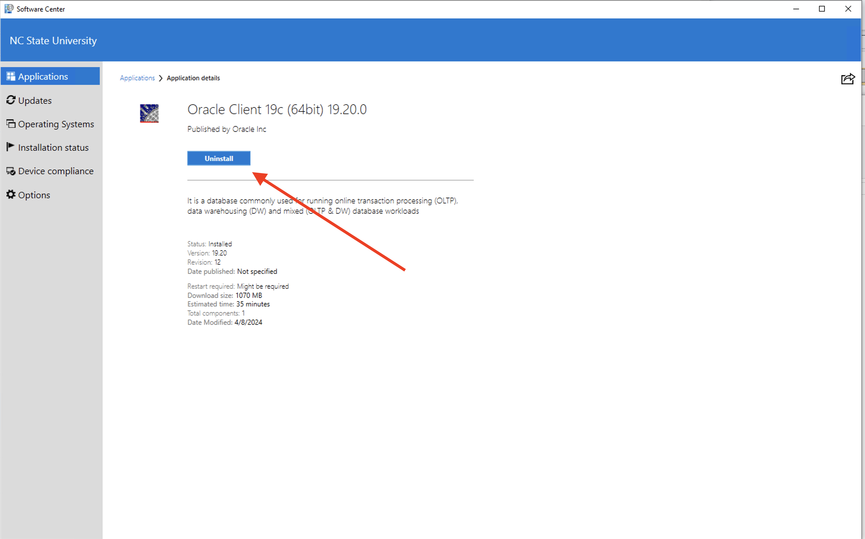 Once the installation process of the "Oracle Client 19c (64bit) 19.20.0" is complete, you should see the word "Uninstalled" displayed under the status of the installation in the Software Center.