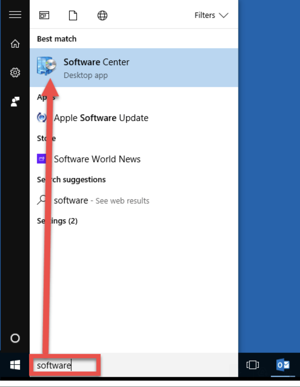 To open the Software Center program, search for it on your device by typing "software" in the search box and selecting the Software Center option. The Search box will be in or near your Windows start menu.